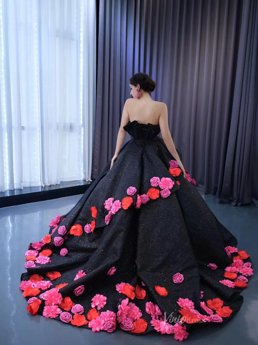 Black 3D Flowers Wedding Dresses Strapless Sparkly Ball Gown 67547