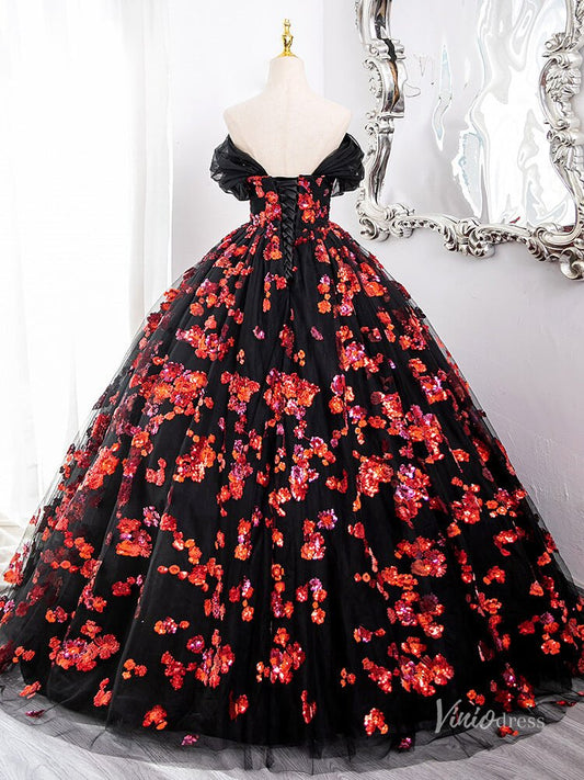 Black and Red Sparkly Floral Lace Prom Ball Gown Off the Shoulder Quinceanera Dresses BG006