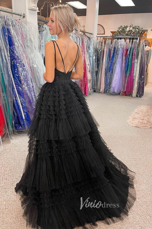 Black Layered Ruffle High Low Prom Dresses Spaghetti Strap Evening Gown FD3052