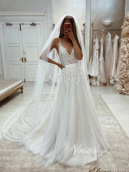 Glittery A-line V-neck Wedding Dresses Beaded Bodice VW2064