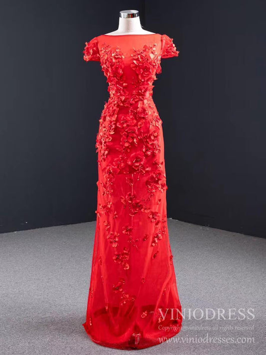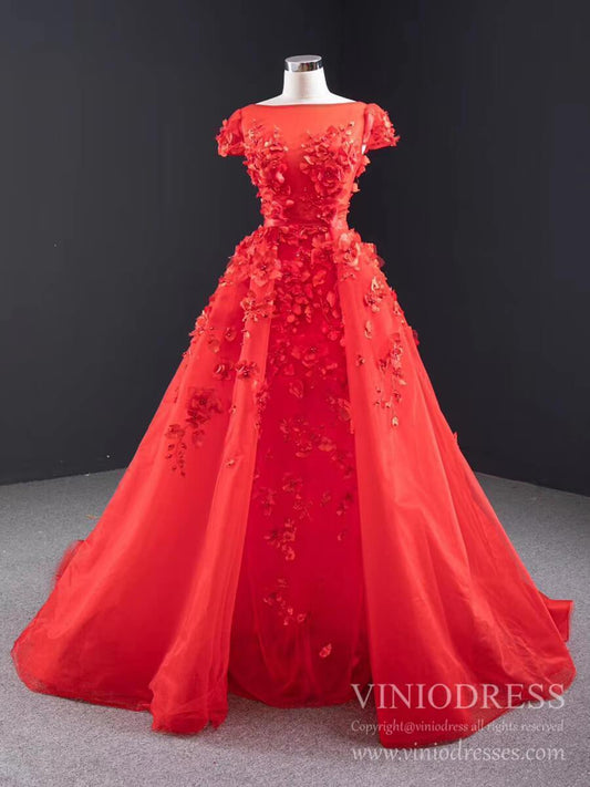 3D Floral Red Long Prom Dresses Detachable Train Mermaid Formal Dress FD2119