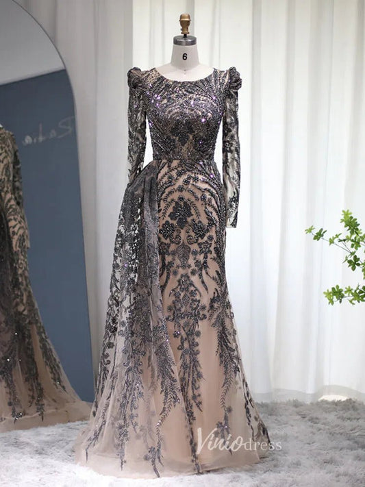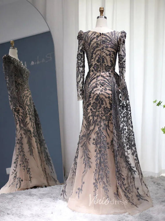 3D Floral Black and White Mermaid Prom Dresses with Removable Long Sleeves FD4045