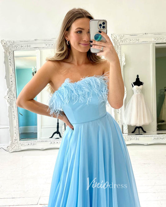 Light Blue Strapless Prom Dresses Feathers Evening Dress FD3134