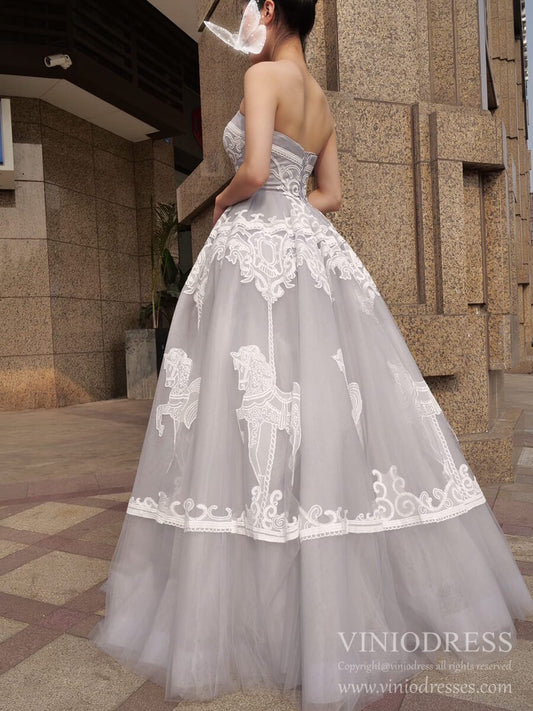 Strapless Silver Tulle Prom Dresses Vintage Horse Lace Formal Dress FD1981 viniodress