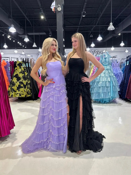Strapless Tulle Prom Dress with Slit, Pleated Bodice & Beaded Tiered Bottom - FD6071