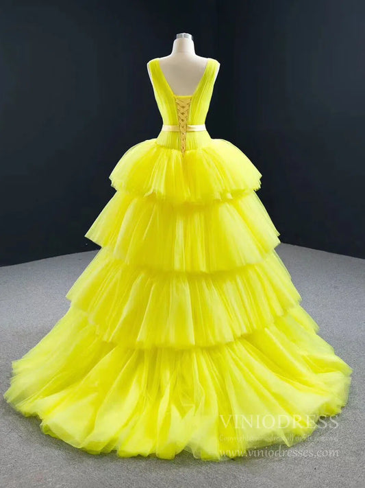 Tiered Yellow Sweet 15 Dress Simple Tulle Quinceanera Dresses 67154