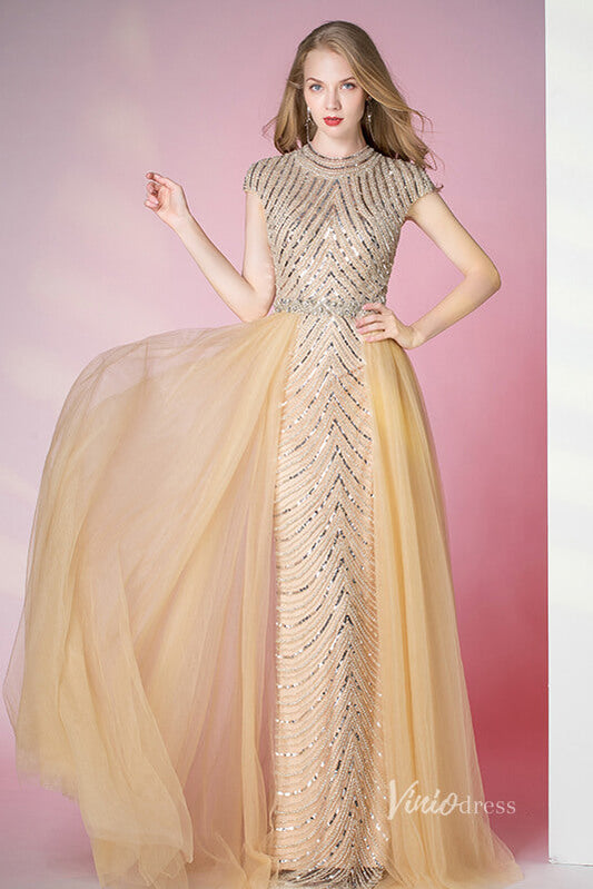 Vintage Gold Beaded Formal Evening Dress Overskirt Prom Dress FD2375