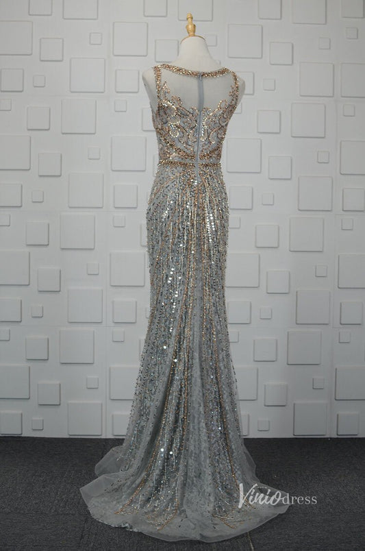 Vintage Gold Beaded Sheath Prom Dress Grey Evening Dress FD2668