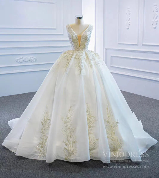 Vintage Gold Lace Wedding Dresses Plunging V Neck Wedding Gown VW1774
