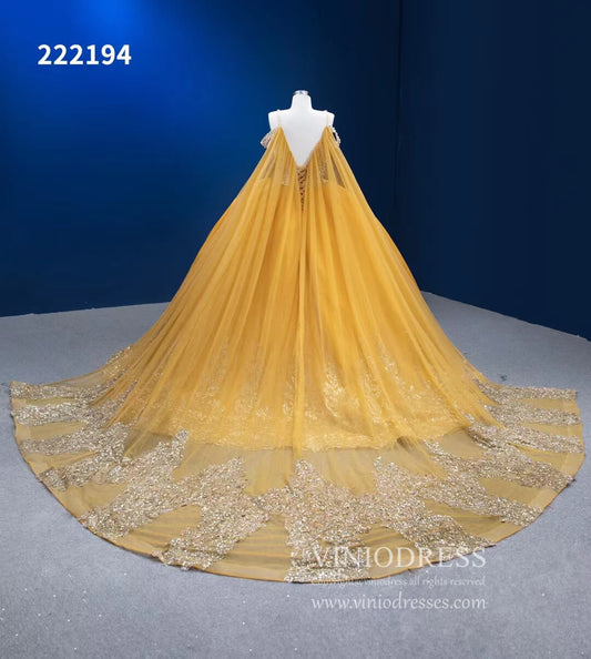 Vintage Gold Wedding Dress Cape Sleeve Cinderella Ball Gown 222194