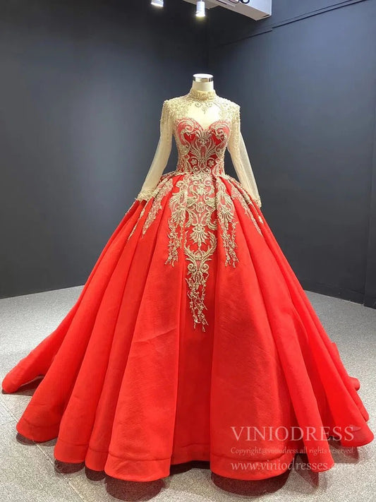 Vintage Mock Neck Red Wedding Dresses Beaded Gold Ball Gowns viniodress