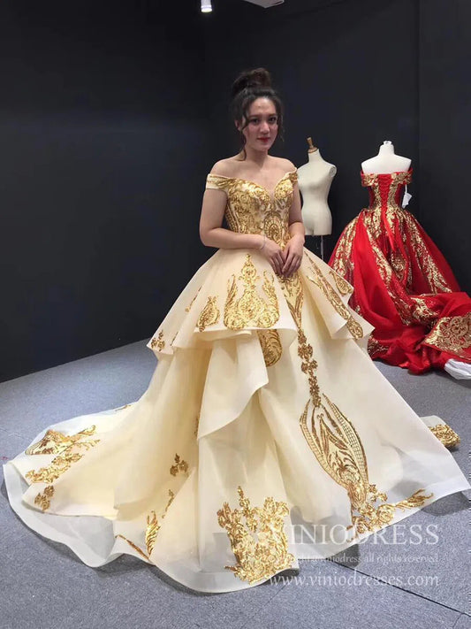 Vintage Off the Shoulder Quinceanera Dresses Gold Sequin Prom Dress 67024 viniodress