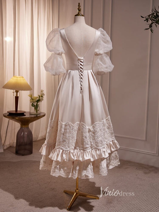 Vintage Puff Sleeve Gown Tea Length Champagne Satin Prom Dresses BJ010