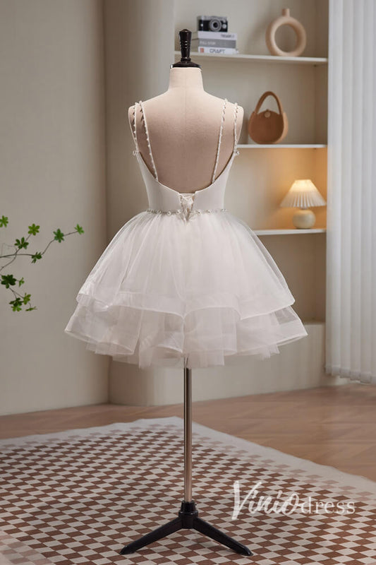 White Spaghetti Strap Homecoming Dresses Ruffled Tulle Short Prom Dress SD1615