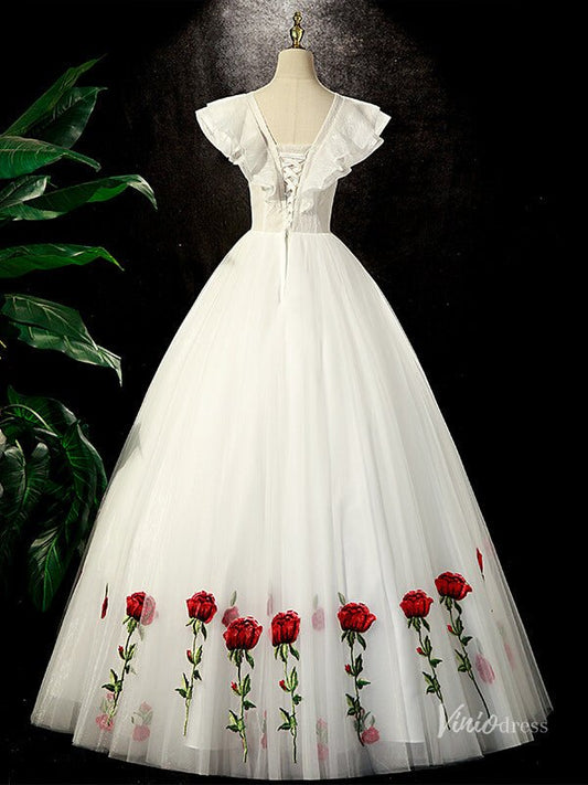 White Tulle Prom Dresses Red Rose Flower Ball Gowns Princess Dresses BG049
