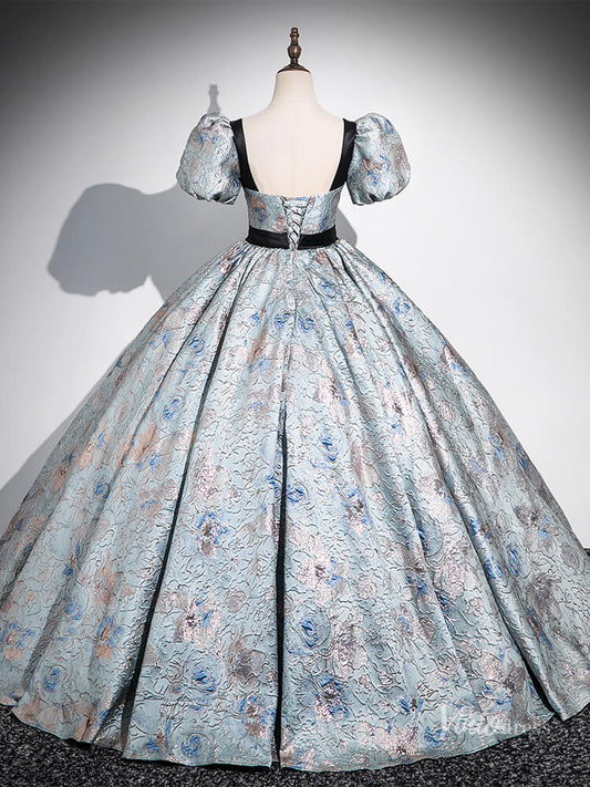 Blue Puffed Sleeve Jacquard Prom Ball Gown Sweetheart Neck Quinceanera Dresses BG054
