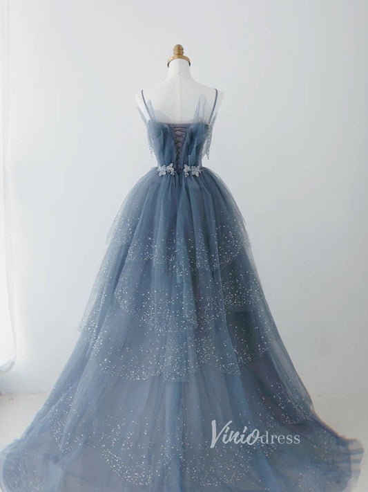 Blue Sparkly Tulle Prom Dresses Spaghetti Strap Evening Dress FD3223