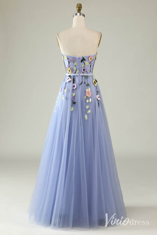 Blue Sweetheart Neck Floral Prom Dresses Strapless Lace Applique Formal Gown AD1101