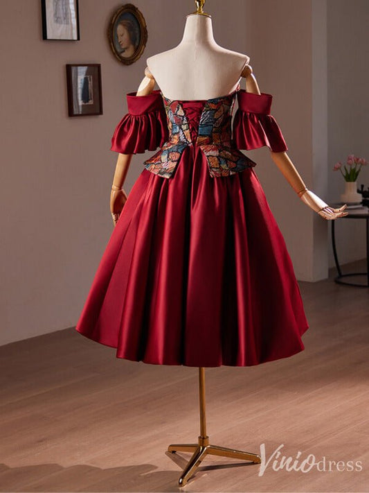 Burgundy Off the Shoulder Satin Homecoming Dress Jacquard Hoco 2024 Graduation Dress 8019