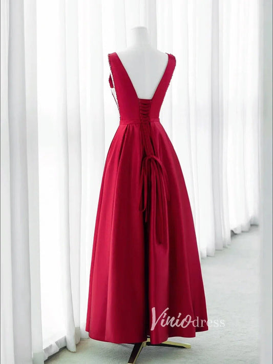 Burgundy Satin Prom Dresses Tea-Length Boat Neck Formal Dress FD3437