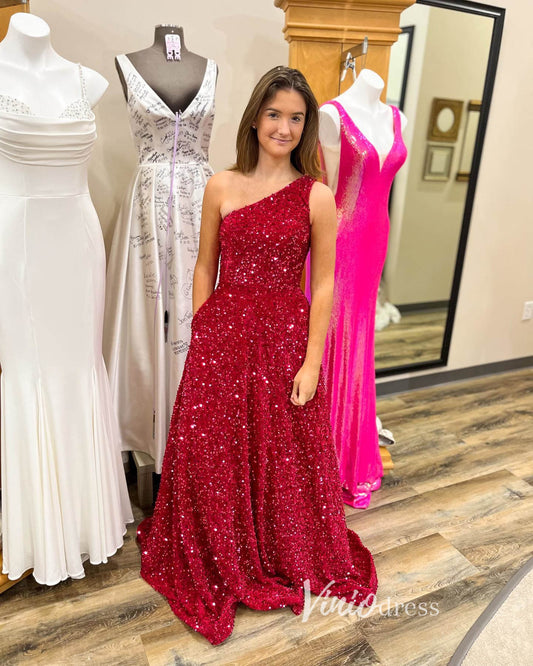 Burgundy Sequin Prom Dresses with Pockets One Shoulder Formal Gown FD3293