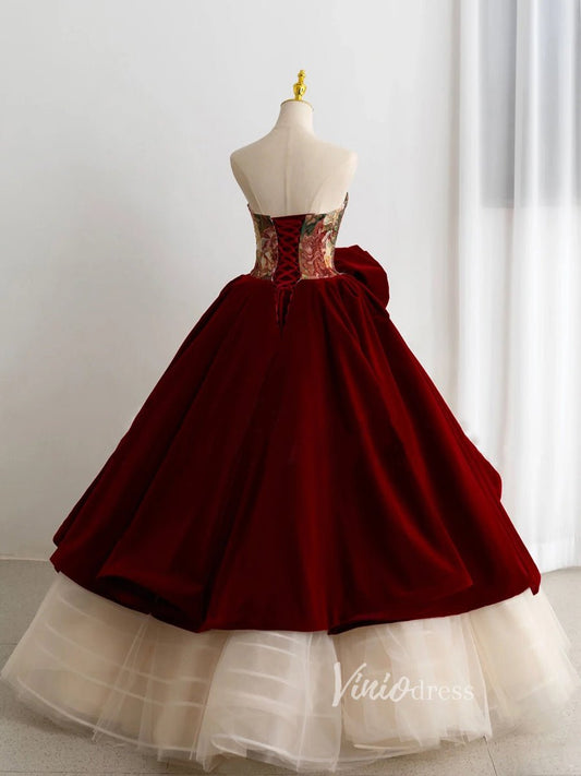 Burgundy Strapless Minimalist Prom Ball Gown Velvet Belt Quinceanera Dresses BG013