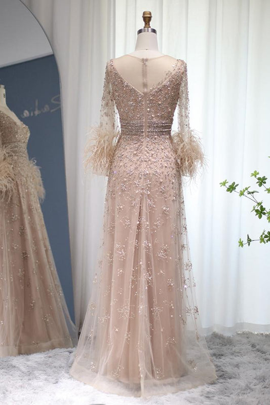 Champagne Pink Beaded Evening Dresses Long Sleeves Feather Prom Dress FD3020