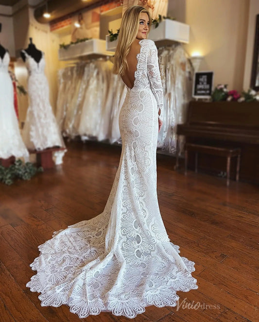 Bohemian Lace Mermaid Wedding Dress with Long Sleeves, Deep V Neckline & Open Back – BH107