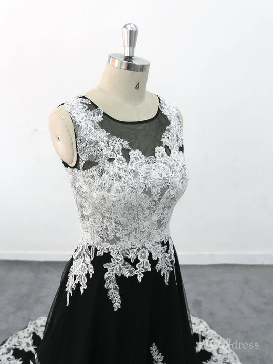 Dramatic Black Wedding Dress with White Lace Appliques, Illusion Neckline, and Chapel Train – BK122