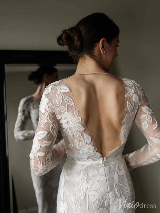 Ivory Long Sleeve Floral Lace Wedding Dress with Plunging V-Neck and Open Back – ML152
