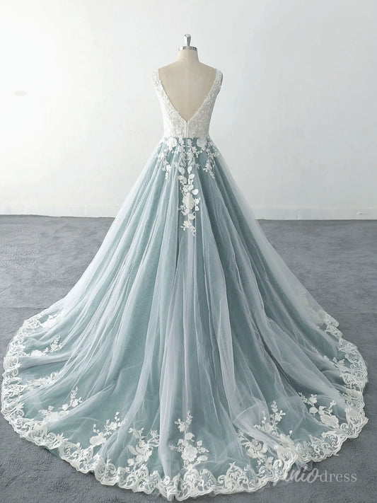 Romantic Dusty Blue Wedding Dress with Floral Lace Appliques, V-Neck Bodice, and Scalloped Lace Hem – FW219