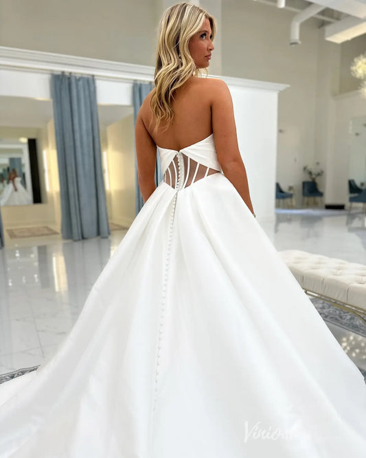 Elegant Satin Ball Gown Wedding Dress with Sweetheart Neckline, Illusion Corset Back & Button Chapel Train – MS144