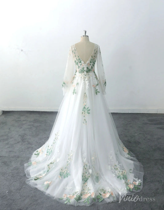 Romantic Ivory Floral Lace Wedding Dress with Long Sleeves, V-Neck Bodice, and Embroidered Skirt – FW225
