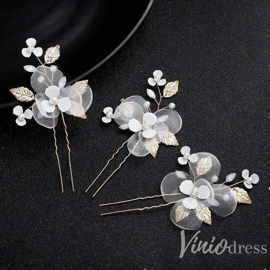 Ivory 3D Floral Hairpins with Crystals and Gold Leaves ACC1159
