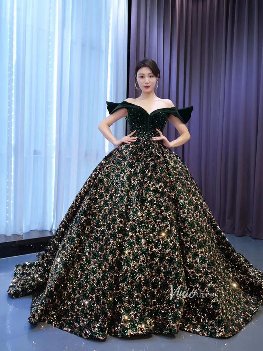 Sparkling Gold Ball Gown Prom Dresses Off Shoulder Quinceañera Dress viniodress