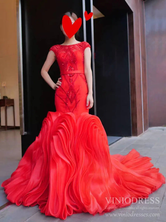 Beaded Red Mermaid Prom Dresses Plunging V-neck Formal Dress 67151 viniodress
