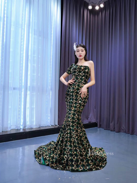 Green Sequin Mermaid Prom Dress One Shoulder Sleeve Evening Dress 67476
