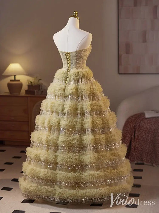Light Green Sparkly Ruffled Ball Gown – Strapless Beaded Corset Dress with Layered Tulle BJ076