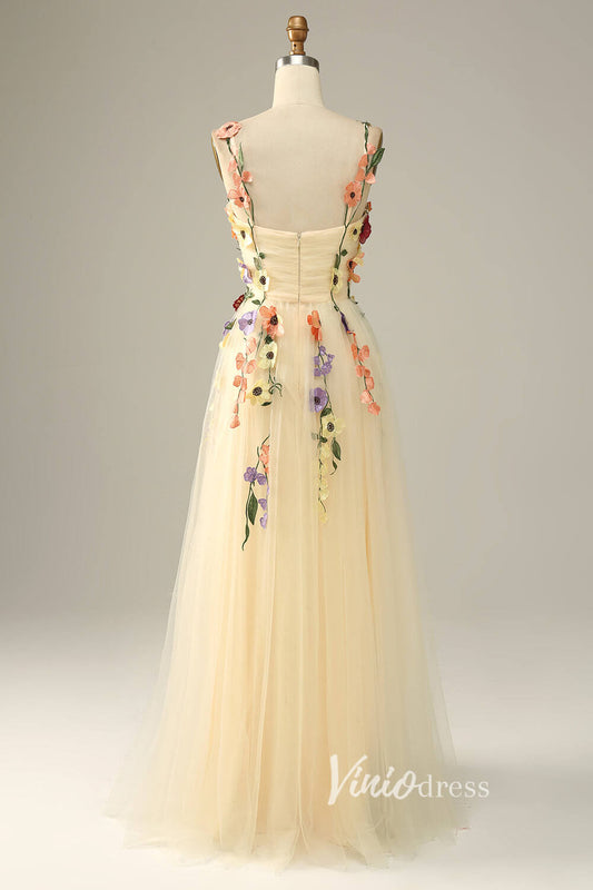 Champagne Tea-Length Floral Embroidered Gown | Strapless Tulle Dress with Pink & Yellow Flowers and Corset Back AD1078