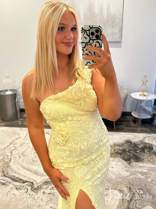 Soft Yellow One-Shoulder Lace Evening Dress with Slit – FD6137