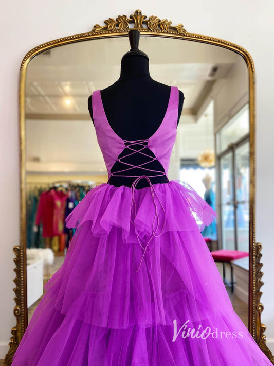 Purple Layered Ruffle Prom Dresses Scoop Neck Evening Dress FD2930