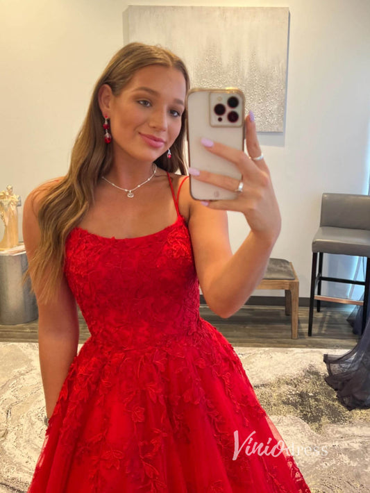 Red Lace Applique Prom Dresses Spaghetti Strap Evening Dress FD2929