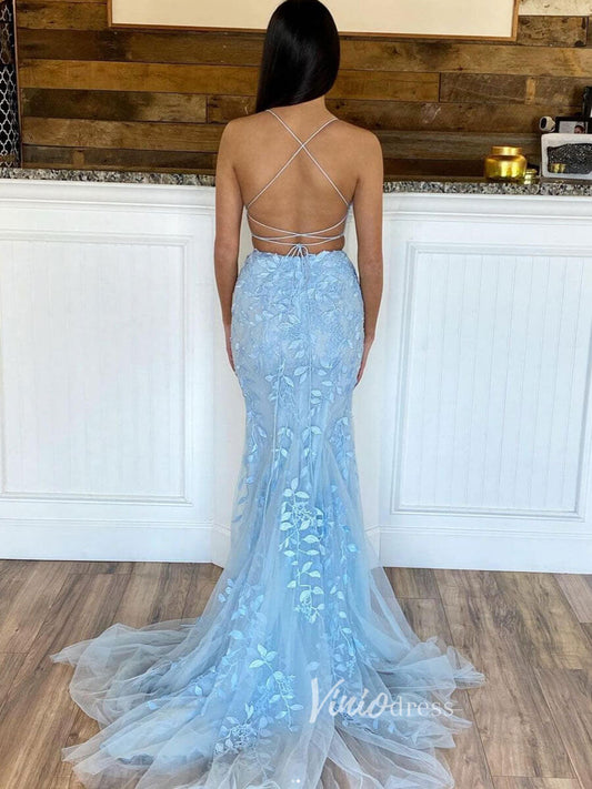Blue Spaghetti Strap Prom Dresses Lace Applique Evening Dress FD3081