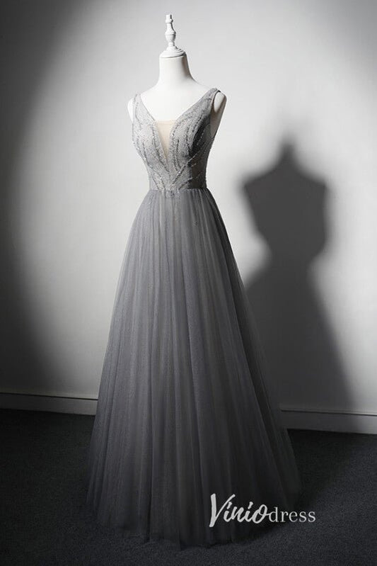 Grey Shimmering Formal Dresses Plunging V-Neck Evening Dress AD1026