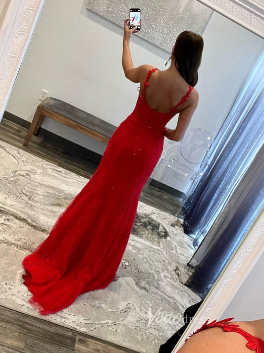 Red Lace Applique Prom Dresses Mermaid Spaghetti Strap Evening Dress FD3577