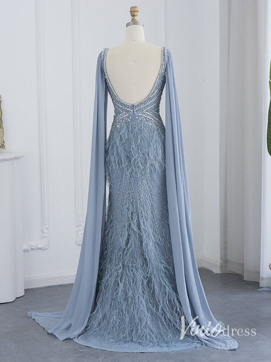 Gorgeous Beaded Mermaid Evening Dresses with Feathers Extra Long Sleeve Pageant Dress AD1166