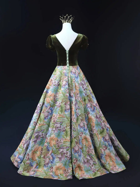 Olive Green Jacquard Prom Dresses with Puffed Sleeve, Corset Back, Quinceanera Dresses SU045