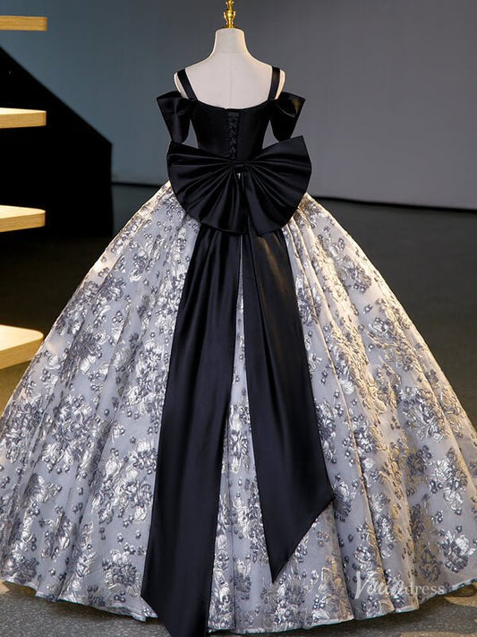 Grey Prom Ball Gown with Silver Floral Jacquard Bow Tie Quinceanera Dresses BG067