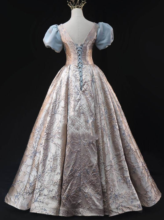 Dusty Blue Floral Jacquard Prom Ball Gown Sequin Puffed Sleeve Quinceanera Dresses BG065