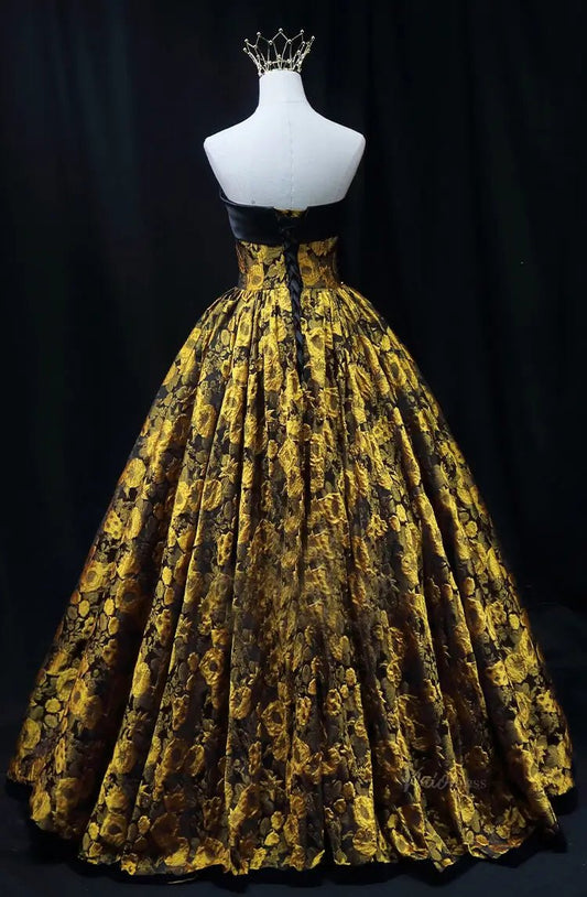 Yellow Jacquard Floral Prom Dresses Strapless Quinceanera Dresses SU079